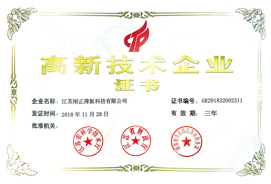 熱烈祝賀江蘇剛正薄板科技有限公司被認定為高新技術企業(yè)