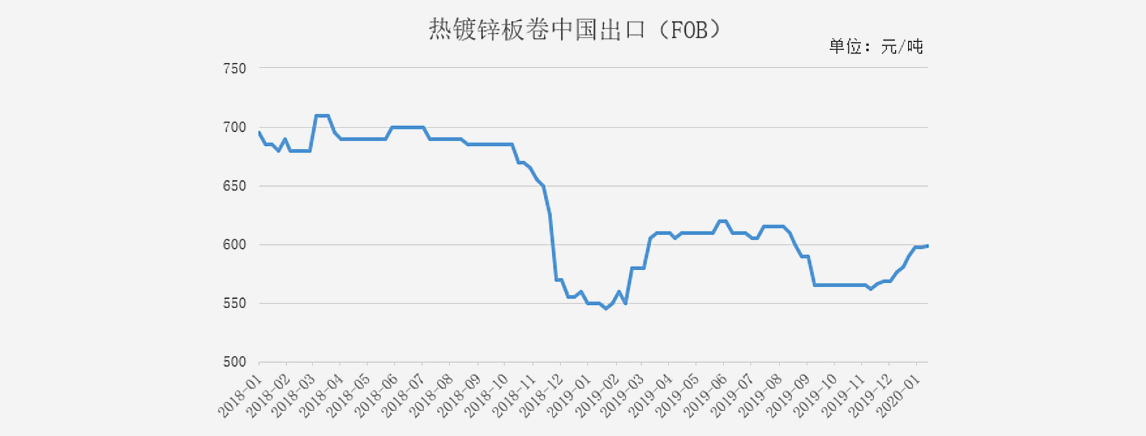 跟隨國內(nèi)涂鍍板卷價(jià)格盤整趨強(qiáng),出口FOB價(jià)格繼續(xù)呈現(xiàn)窄幅向上局面,截至1月31日,鍍鋅板卷月整體漲幅為9美元/噸,至599美元/噸,相對(duì)而言,本月漲幅相對(duì)收窄,春節(jié)因素導(dǎo)致需求減弱,價(jià)格上漲難以持續(xù)。