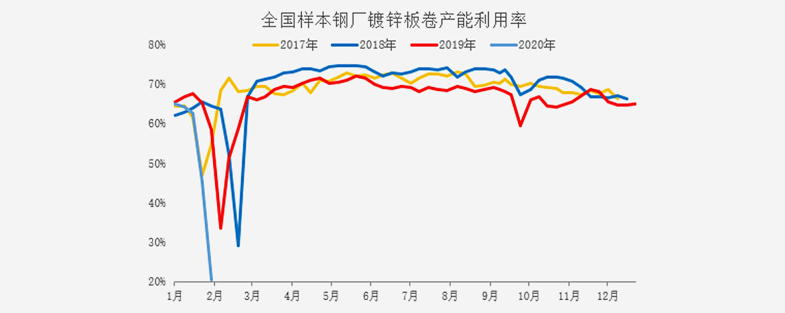 從工廠生產(chǎn)情況了解,最新同口徑樣本鍍鋅板卷企業(yè)產(chǎn)能利用率僅為20.56%,相對(duì)差于去年農(nóng)歷同期的33.66%,看得出,春節(jié)疊加突發(fā)衛(wèi)生事件影響較為明顯。當(dāng)前而言,短流程企業(yè)原料相對(duì)緊缺,生產(chǎn)受影響明顯;同時(shí),長流程企業(yè)成品材庫存壓力較大,生產(chǎn)同樣面臨停限產(chǎn)壓力。當(dāng)然,更明顯的是,下游復(fù)工延遲,需求難以啟動(dòng),物流運(yùn)輸不暢等綜合因素,也將進(jìn)一步壓低2月上中旬開工生產(chǎn)情況。